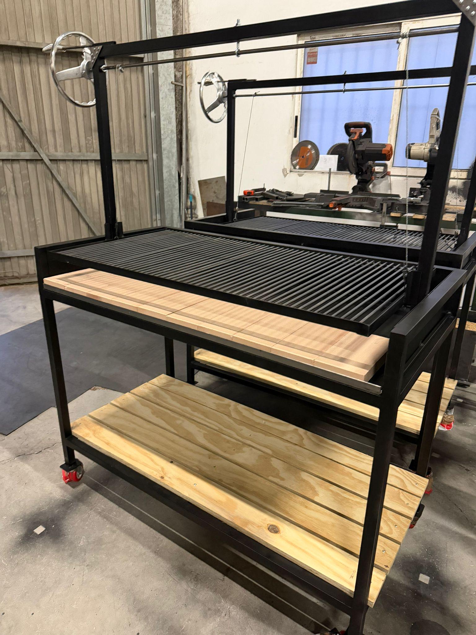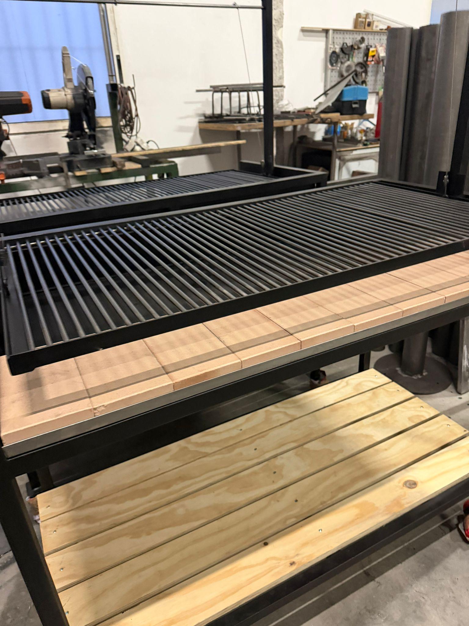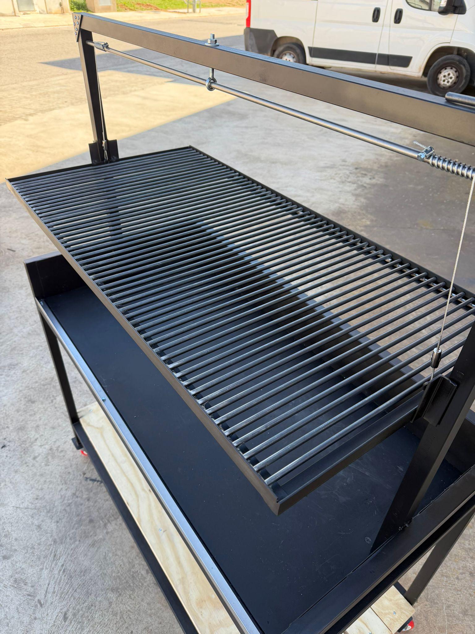 Parrilla Pro elevable estilo Santa María, diseñada para uso intensivo con leña o carbón. Fabricada en acero reforzado, incorpora sistema elevable, caja de fuego con refractarios y estructura móvil, ofreciendo máximo control del fuego, eficiencia térmica y versatilidad profesional.